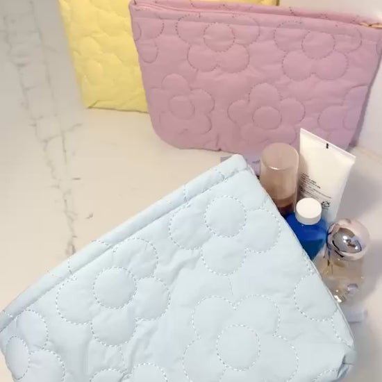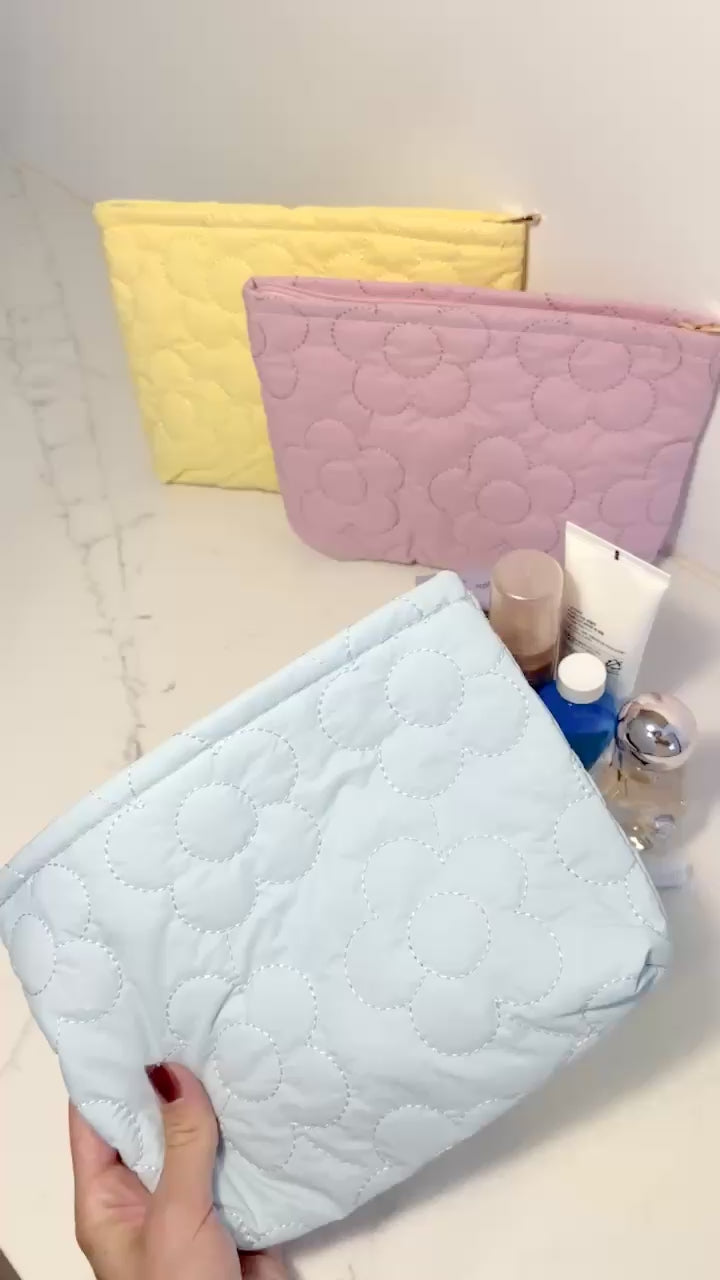- Brighten up your travel routine with Quilted Floral Cosmetic Bag in soft Gallen blue